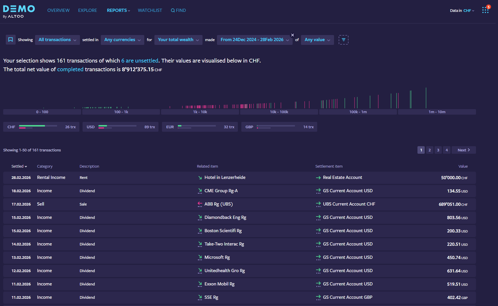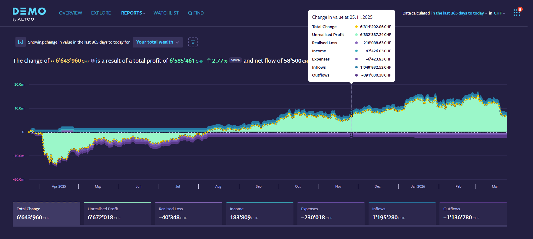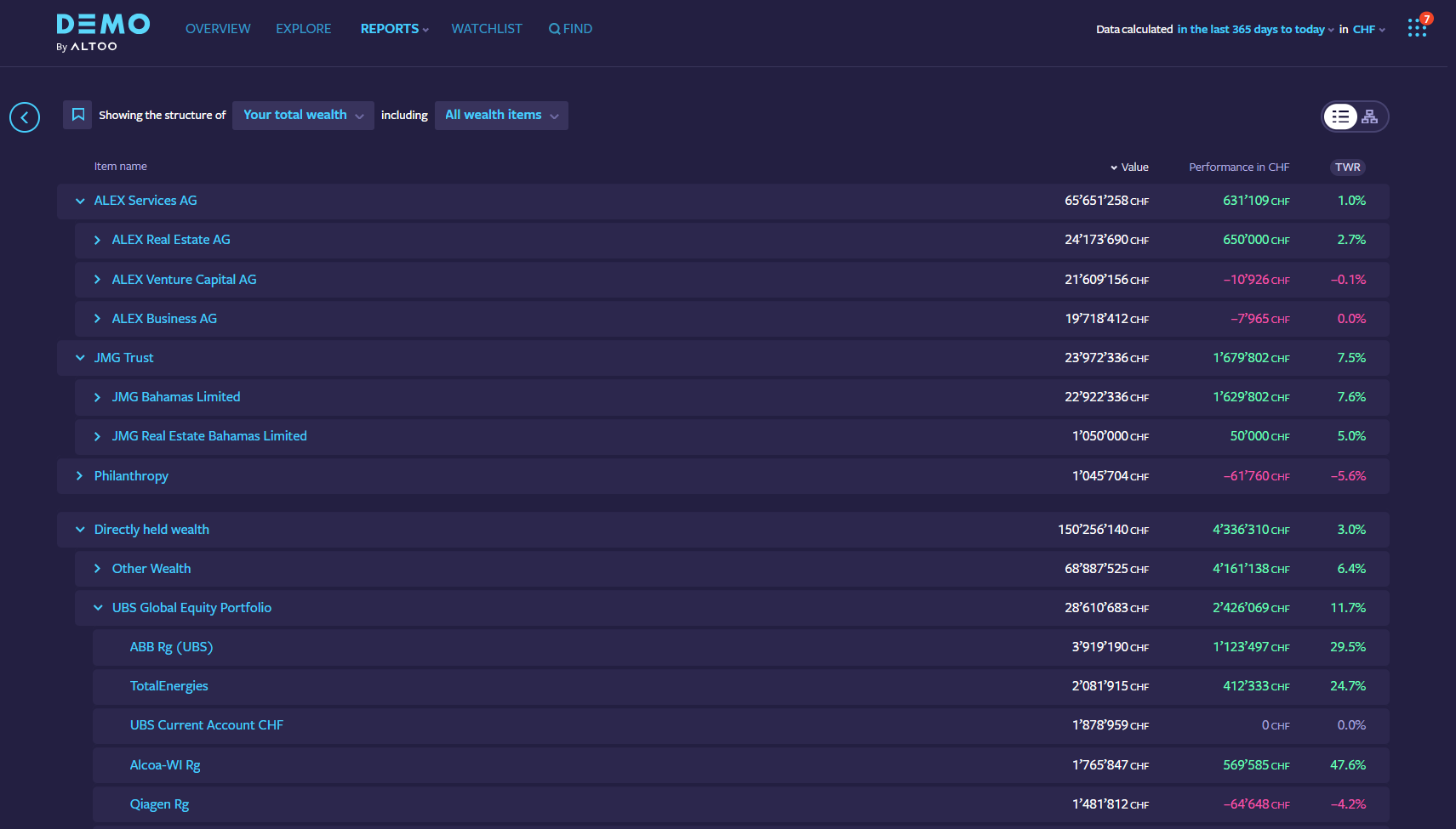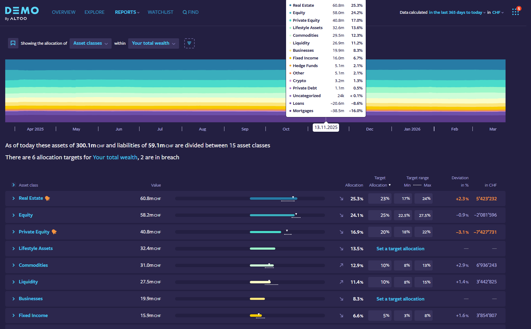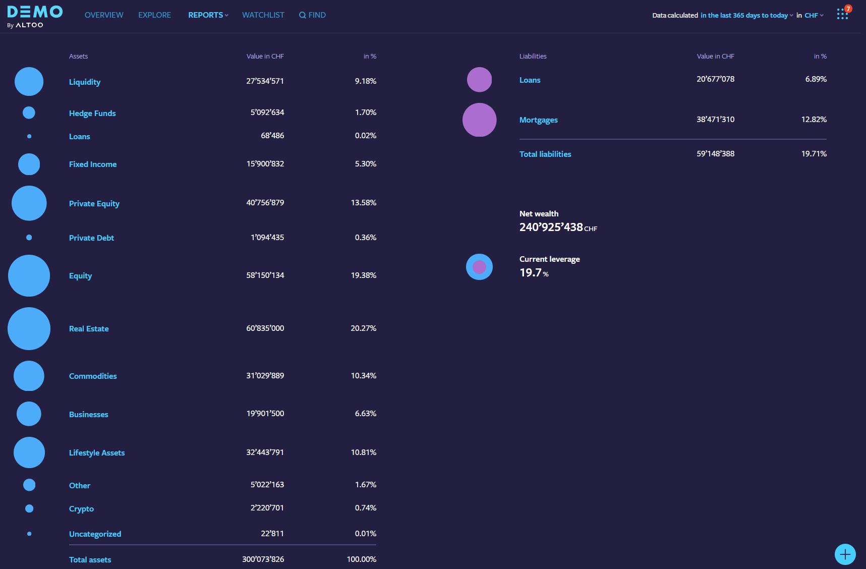 The Altoo Wealth Platform contains a selection of reports, which help you deep dive into your wealth from a fixed reporting perspective.