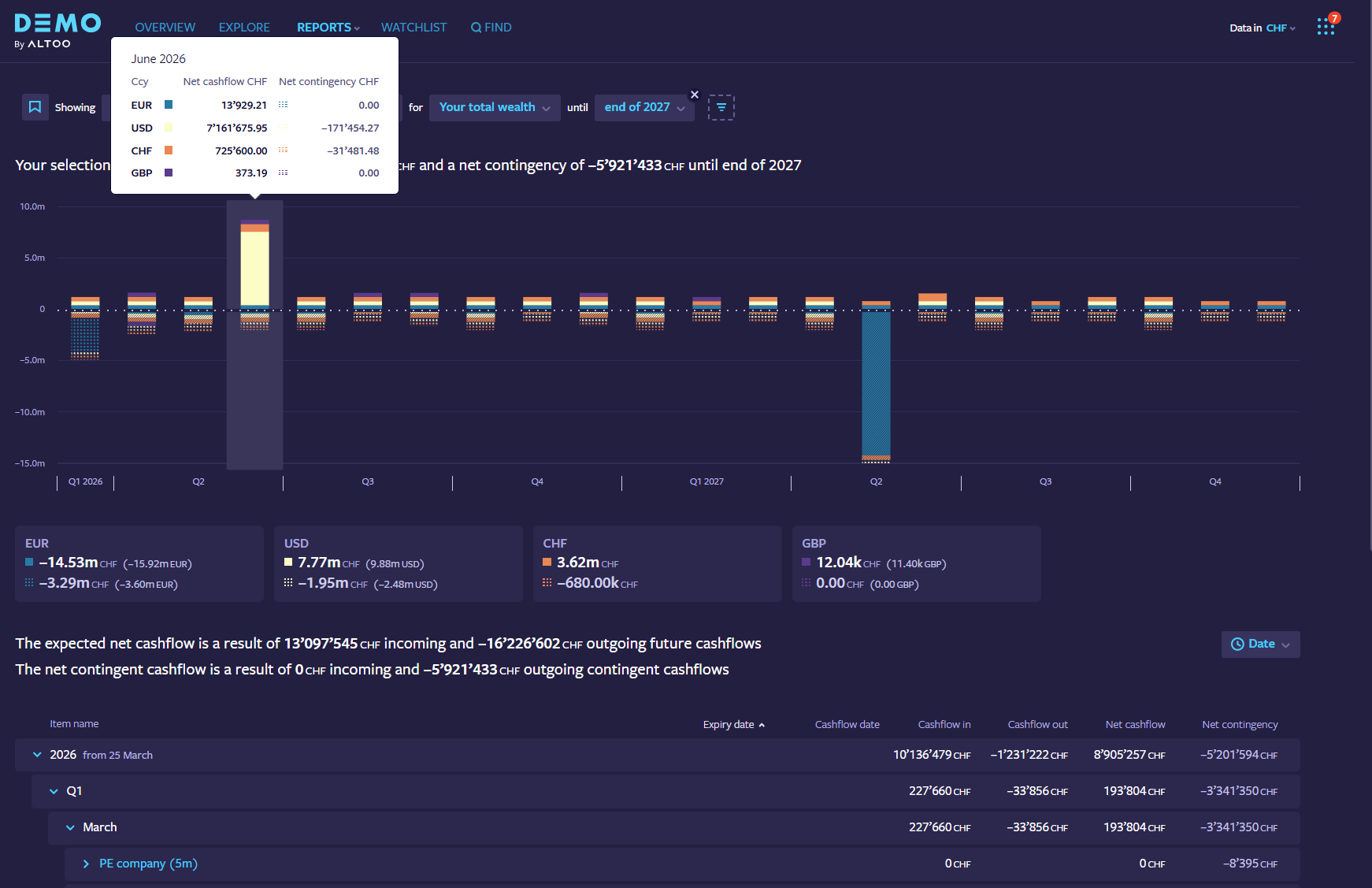The report will display your current liquidity and a forecast into the future by taking into account the future cash flows that are recorded on the Altoo Wealth Platform.