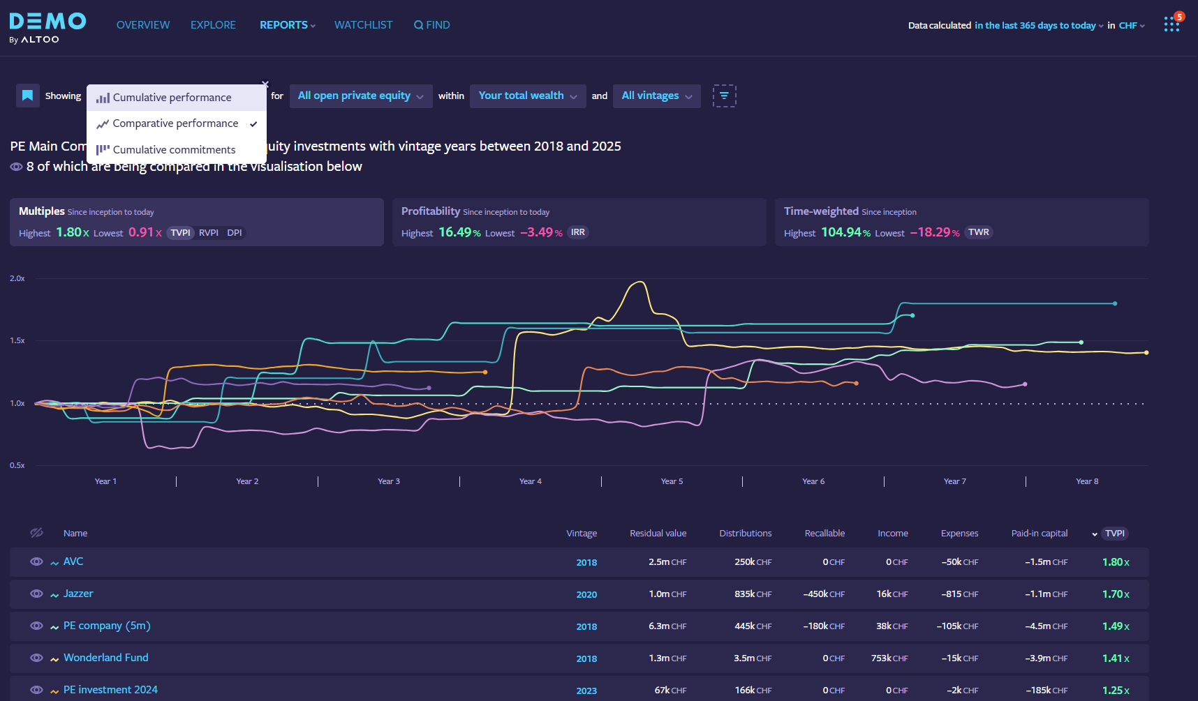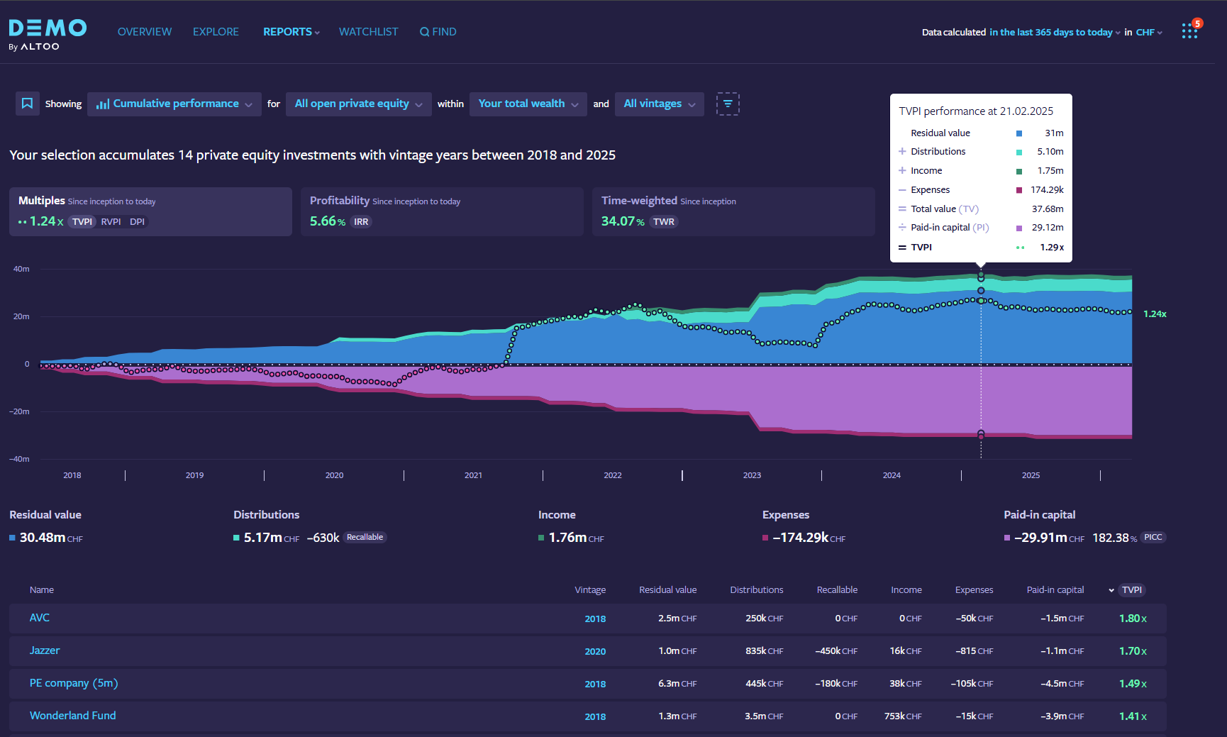 By default, the report lists all your active private equity investments at a glance, including relevant industry figures like distributions, paid in capital or open commitments. In addition, the report is able to calculate cumulative TVPI (RVPI and DPI) and IRR performance for any set of your private equity assets.