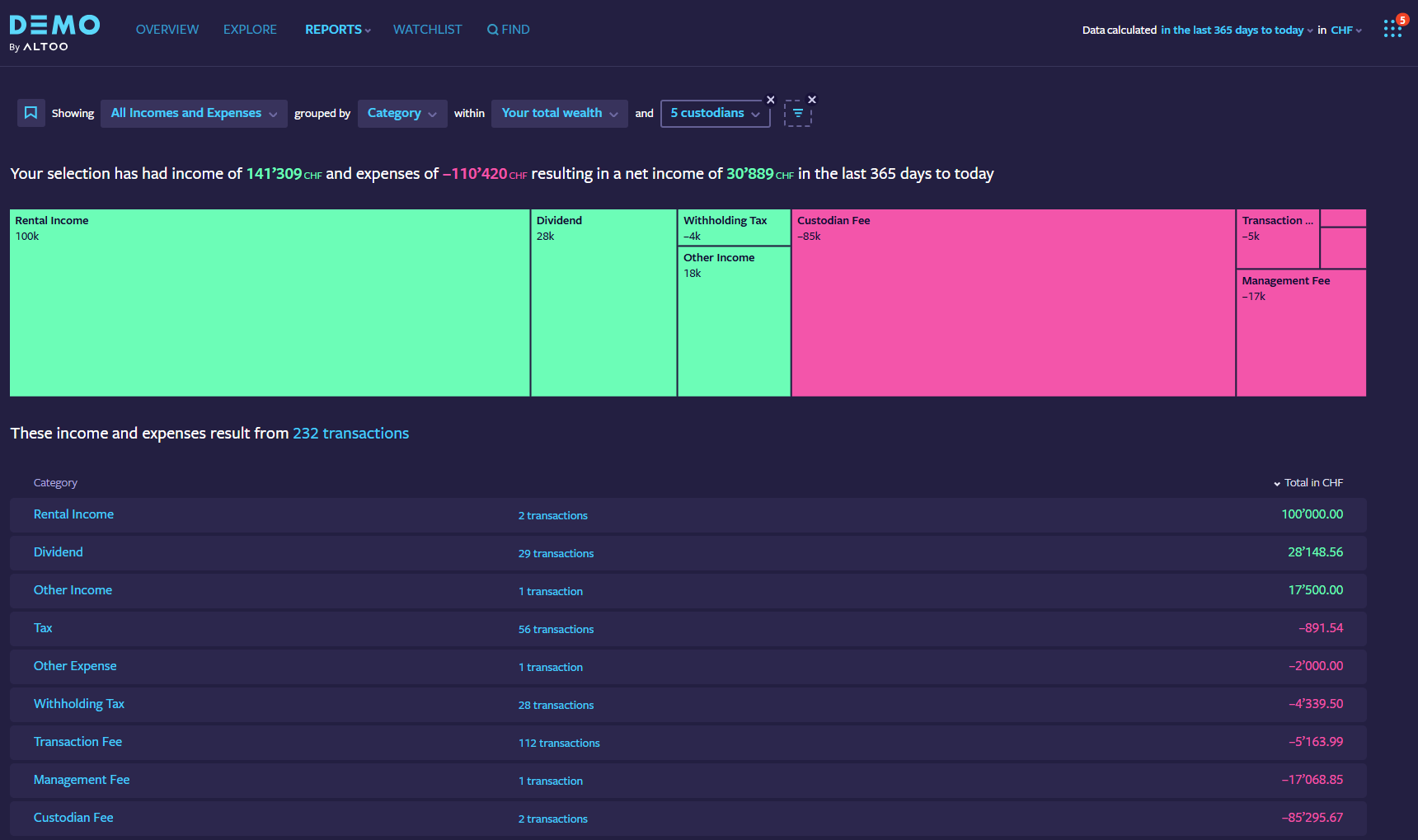 The Income and Expenses report enables you to analyse and track all income and expenses across your entire wealth in one place.
